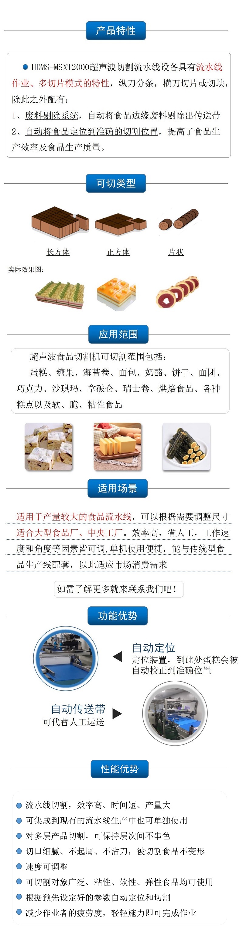 該設備配備雙把超聲波刀片,既可切方蛋糕,也可同時切兩個圓蛋糕,還具有自動上水洗刀、安全光柵的人性化功能,效率高,更方便 |